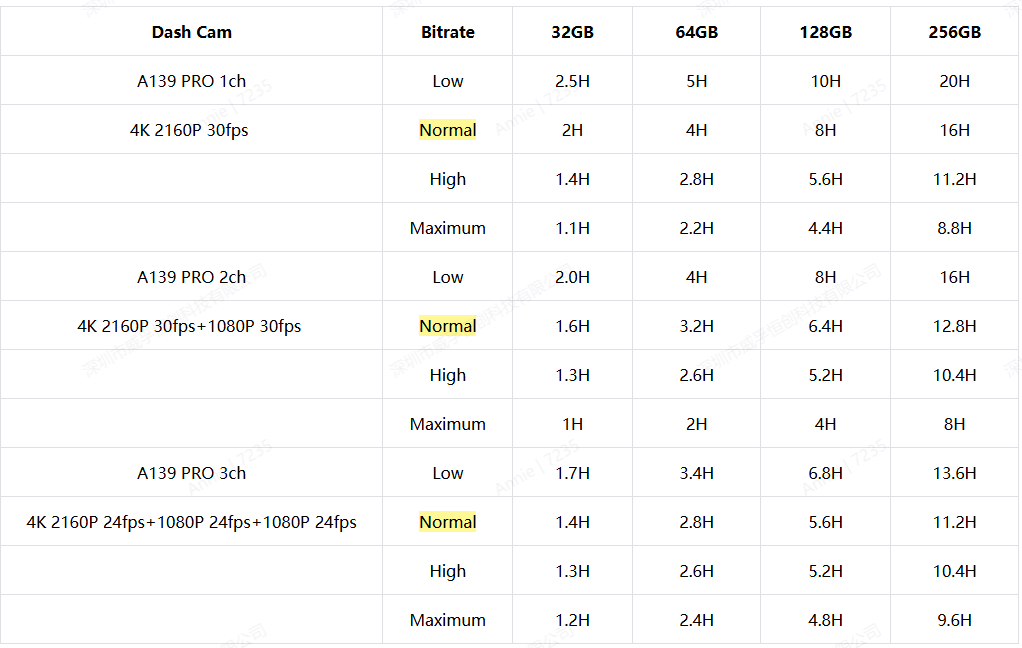 Below is the estimated time a card can record with different bitrates for normal recording.