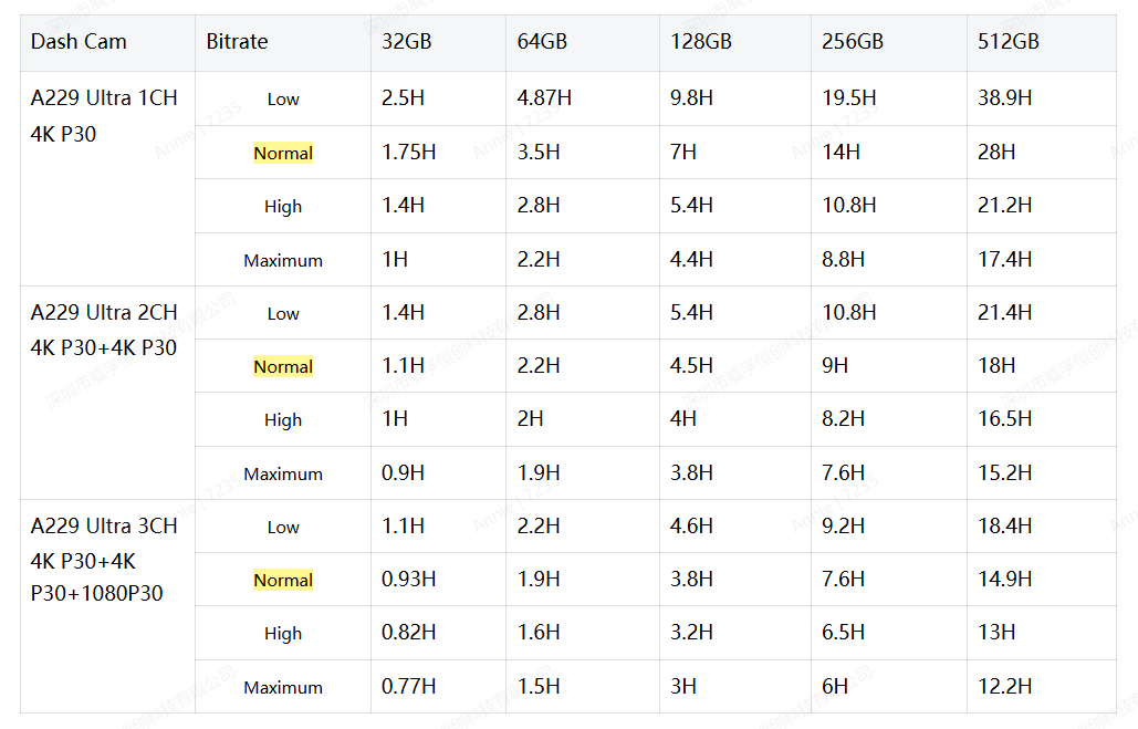 Below is the estimated time a card can record with different bitrates for normal recording.